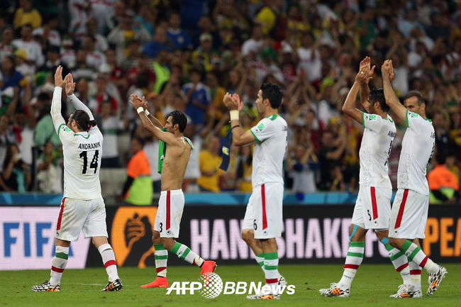 경기후 이란 선수들이 팬들에 인사를 하고 있다./ photo@osen.co.kr < 사진 > ⓒAFPBBNews = News1