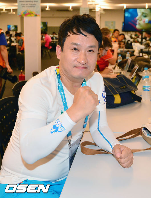 [OSEN=쿠이아바(브라질), 민경훈기자] 17일(이하 한국시간) 홍명보감독이 이끄는 한국 축구대표팀이 2014 브라질 월드컵 조별리그 첫 경기가 열리는 쿠이아바의 아레나 판타날에서 러시아 전을 하루 앞두고 공식 훈련을 가질 예정인 가운데 아레나 판타날 미디어 센터에 도착한 개그맨 서경석이 파이팅을 외치고 있다.