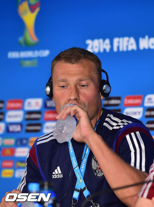 [OSEN=쿠이아바 (브라질), 민경훈기자] 17일(이하 한국시간) 홍명보감독이 이끄는 한국 축구대표팀이 2014 브라질 월드컵 조별리그 첫 경기가 열리는 쿠이아바의 아레나 판타날에서 러시아 전을 하루 앞두고 공식 훈련을 가질 예정인 가운데 아레나 판타날 경기장에서 러시아 바실레 베레주츠키가 기자회견을 하며 물을 마시고 있다.