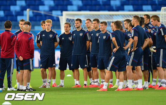 [OSEN=쿠이아바 (브라질), 민경훈기자] 17일(이하 한국시간) 홍명보감독이 이끄는 한국 축구대표팀이 2014 브라질 월드컵 조별리그 첫 경기가 열리는 쿠이아바의 아레나 판타날에서 러시아 전을 하루 앞두고 공식 훈련을 가질 예정인 가운데 아레나 판타날 경기장에서 러시아 대표팀이 먼저 훈련을 갖고 있다.