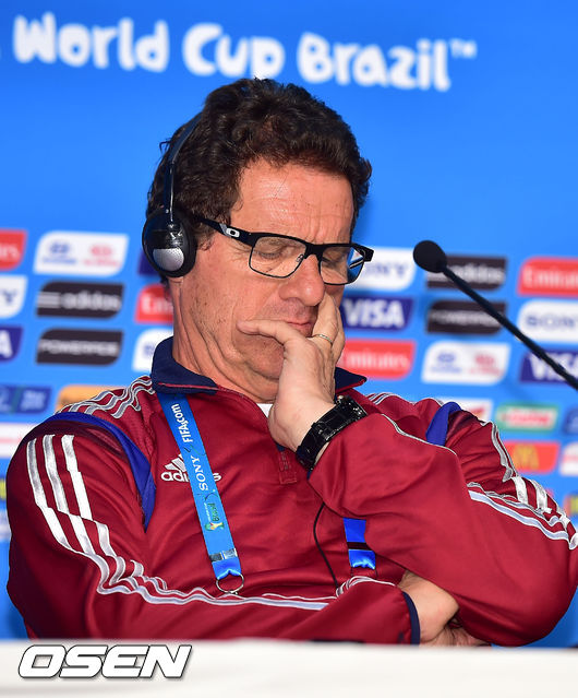[OSEN=쿠이아바 (브라질), 민경훈기자] 17일(이하 한국시간) 홍명보감독이 이끄는 한국 축구대표팀이 2014 브라질 월드컵 조별리그 첫 경기가 열리는 쿠이아바의 아레나 판타날에서 러시아 전을 하루 앞두고 공식 훈련을 가질 예정인 가운데 아레나 판타날 경기장에서 러시아 파비오 카펠로 감독이 기자회견을 하며 생각에 잠겨있다.