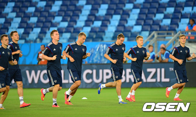 [OSEN=쿠이아바 (브라질), 민경훈기자] 17일(이하 한국시간) 홍명보감독이 이끄는 한국 축구대표팀이 2014 브라질 월드컵 조별리그 첫 경기가 열리는 쿠이아바의 아레나 판타날에서 러시아 전을 하루 앞두고 공식 훈련을 가질 예정인 가운데 아레나 판타날 경기장에서 러시아 대표팀이 먼저 훈련을 갖고 있다.