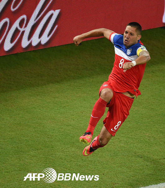 전반 미국 뎀프시가 선제골을 성공시키고 기뻐하고 있다. 이번 브라질 월드컵 최단시간 골로 역대 5번째 빠른 골이다.
