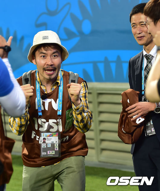 [OSEN=쿠이아바 (브라질), 민경훈기자] 17일(이하 한국시간) 홍명보감독이 이끄는 한국 축구대표팀이 2014 브라질 월드컵 조별리그 첫 경기가 열리는 쿠이아바의 아레나 판타날에서 러시아 전을 하루 앞두고 공식 훈련을 가질 예정인 가운데 아레나 판타날 경기장에 도착한 노홍철과 이영표 해설위원이 즐겁게 얘기를 나누고 있다.