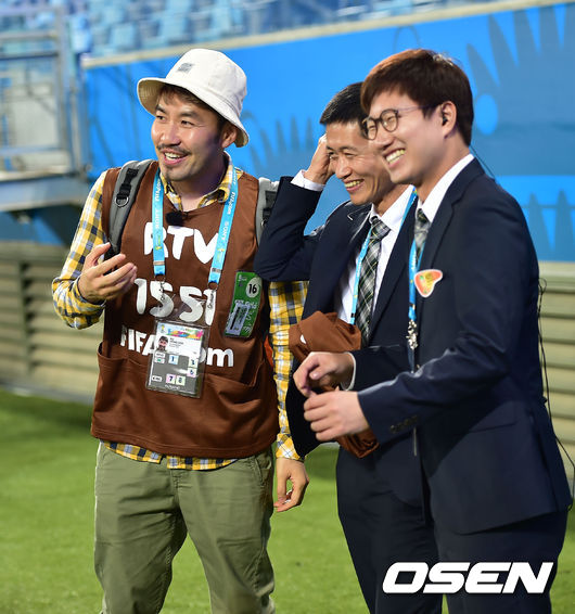 [OSEN=쿠이아바 (브라질), 민경훈기자] 17일(이하 한국시간) 홍명보감독이 이끄는 한국 축구대표팀이 2014 브라질 월드컵 조별리그 첫 경기가 열리는 쿠이아바의 아레나 판타날에서 러시아 전을 하루 앞두고 공식 훈련을 가질 예정인 가운데 아레나 판타날 경기장에 도착한 노홍철과 이영표 해설위원이 즐겁게 얘기를 나누고 있다.