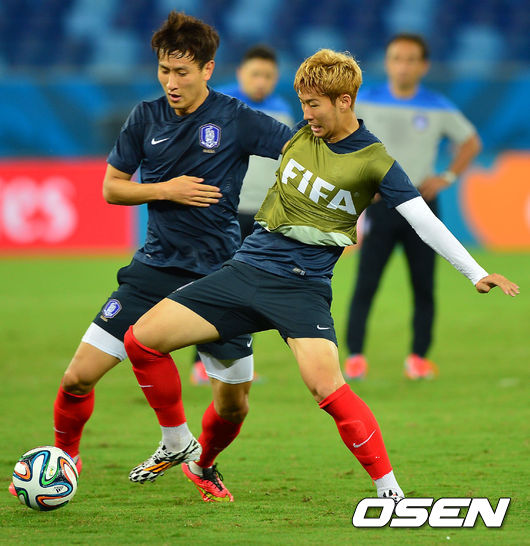 [OSEN=쿠이아바 (브라질), 민경훈기자] 17일(이하 한국시간) 홍명보감독이 이끄는 한국 축구대표팀이 2014 브라질 월드컵 조별리그 첫 경기가 열리는 쿠이아바의 아레나 판타날에서 러시아 전을 하루 앞두고 공식 훈련을 가졌다. 한국 지동원과 손흥민이 아레나 판타날 그라운드 위에서 훈련을 하고 있다.