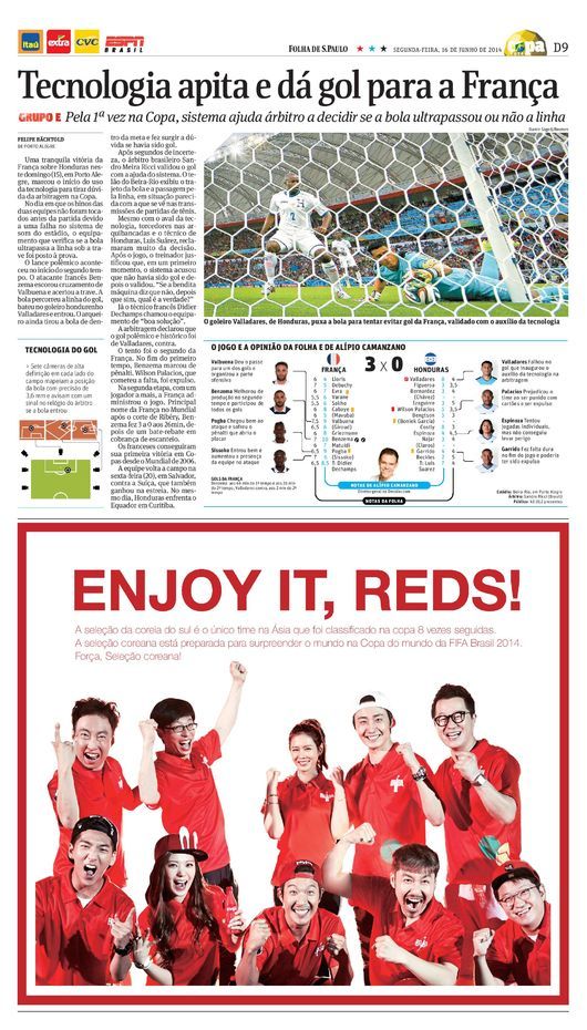 현지시각으로 16일 일간지인 '폴라 데 상파울로' 스포츠섹션 9면의 반면 광고로 게재됐다. 전체적인 빨강색 디자인에 대한민국 공식 응원문구인 '즐겨라, 대한민국!(ENJOY IT, REDS!)'을 강조했다.