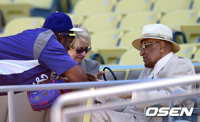 17일(한국시간) 미국 캘리포니아주 로스앤젤레스 다저스타디움에서 열리는 '2014 메이저리그' LA 다저스와 콜로라도 로키스의 경기에 앞서 LA 다저스 푸이그가 메이저리그 사상 유일하게 신인왕, 사이영상, MVP를 수상한 메이저리그 전설 돈 뉴컴과 이야기를 나누고 있다.