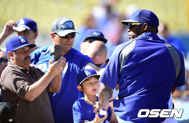 17일(한국시간) 미국 캘리포니아주 로스앤젤레스 다저스타디움에서 열리는 '2014 메이저리그' LA 다저스와 콜로라도 로키스의 경기에 앞서 LA 다저스 푸이그가 팬들에게 사인을 해주고 있다.