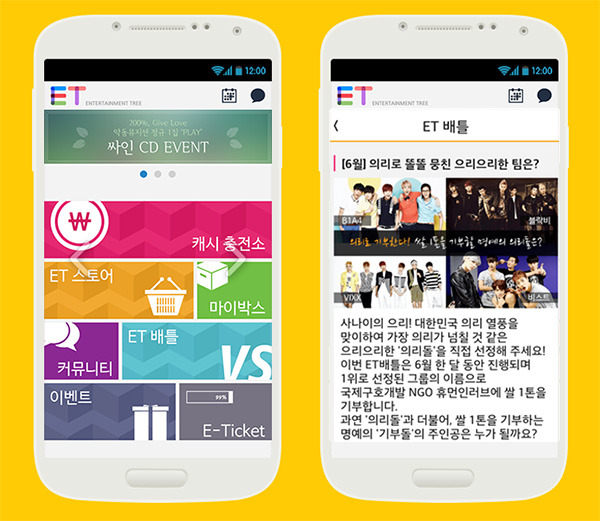 ‘이티’는 음원 서비스 외에도 이색투표 이벤트인 ‘이티 배틀’ 등 앱 안에서 다양한 즐길 거리들을 제공한다는 방침이다. 자신만의 사진과 생활지식 등을 공유하는 커뮤니티, 매일 상품이 쏟아지는 E티켓찬스방 등 다양한 놀이 공간이 마련돼 있으며, 공연정보를 얻고 뮤직비디오도 시청할 수 있다.