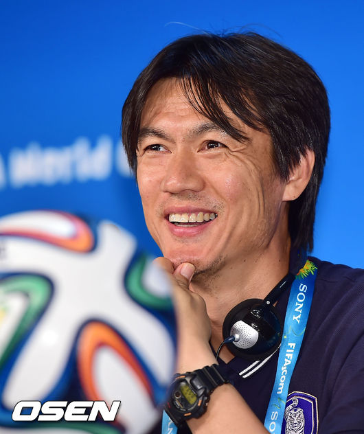[OSEN=쿠이아바 (브라질), 민경훈기자] 17일(이하 한국시간) 홍명보감독이 이끄는 한국 축구대표팀이 2014 브라질 월드컵 조별리그 첫 경기가 열리는 쿠이아바의 아레나 판타날에서 러시아 전을 하루 앞두고 공식 훈련을 가졌다. 훈련 후 열린 대한민국 기자회견에서 홍명보 감독이 환하게 미소짓고 있다.