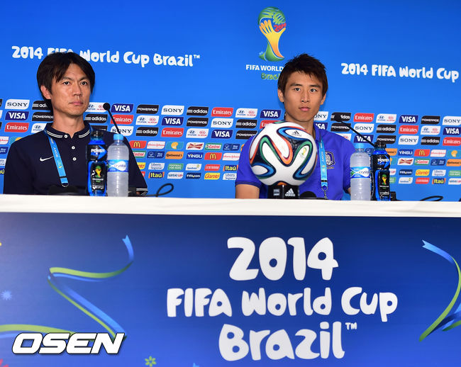 [OSEN=쿠이아바 (브라질), 민경훈기자] 17일(이하 한국시간) 홍명보감독이 이끄는 한국 축구대표팀이 2014 브라질 월드컵 조별리그 첫 경기가 열리는 쿠이아바의 아레나 판타날에서 러시아 전을 하루 앞두고 공식 훈련을 가졌다. 훈련 후 열린 대한민국 기자회견에서 홍명보 감독과 구자철이 질문을 듣고 있다.