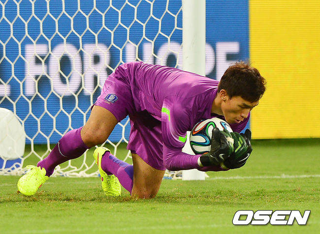 [OSEN=쿠이아바 (브라질), 민경훈기자] 17일(이하 한국시간) 홍명보감독이 이끄는 한국 축구대표팀이 2014 브라질 월드컵 조별리그 첫 경기가 열리는 쿠이아바의 아레나 판타날에서 러시아 전을 하루 앞두고 공식 훈련을 가졌다. 김승규가 수비훈련을 하고 있다.