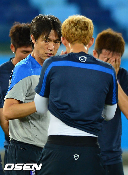 [OSEN=쿠이아바 (브라질), 민경훈기자] 17일(이하 한국시간) 홍명보감독이 이끄는 한국 축구대표팀이 2014 브라질 월드컵 조별리그 첫 경기가 열리는 쿠이아바의 아레나 판타날에서 러시아 전을 하루 앞두고 공식 훈련을 가졌다. 홍명보 감독이 손흥민과 얘기를 나누고 있다.