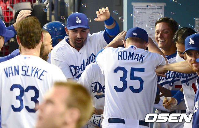 17일(이하 한국시간) 미국 로스앤젤레스 다저스타디움에서 벌어진 LA 다저스와 콜로라도 로키스 경기 3회말 1사 3루타와 실책으로 홈을 밟은 고든을 동료들이 축하해주고 있다.
