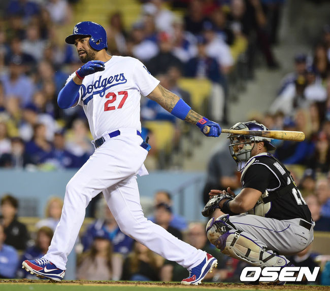 17일(이하 한국시간) 미국 로스앤젤레스 다저스타디움에서 벌어진 LA 다저스와 콜로라도 로키스 경기 3회말 1사 1,2루 맷 켐프가 적시타를 치고 있다.