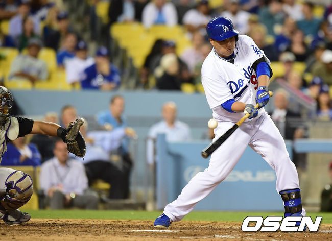 17일(이하 한국시간) 미국 로스앤젤레스 다저스타디움에서 벌어진 LA 다저스와 콜로라도 로키스 경기 4회말 1사 1루 류현진이 버스를 시도했지만 파울이 되고 있다.