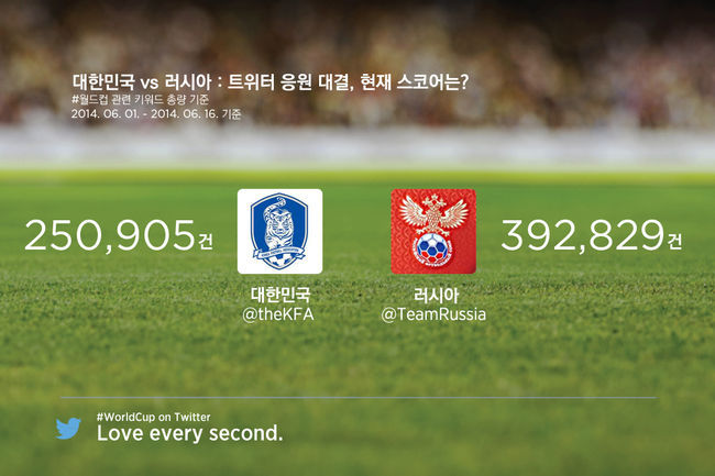 트위터 코리아는 월드컵 분위기가 본격적으로 무르익기 시작한 6월 1일부터 16일까지 한국과 러시아의 월드컵 트윗량을 집계한 결과, 한국이 25만905건으로 러시아 39만2829건의 64% 수준에 그치고 있는 것으로 나타나 SBS와 함께 전 국민적인 관심을 높이기 위한 응원 이벤트를 기획했다.