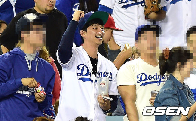 6회말 LA 다저스가 추가점을 뽑자 경기를 관전하던 공유가 기뻐하고 있다./youngrae@osen.co.kr