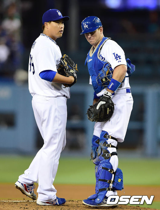 류현진이 마운드에서 A.J 엘리스와 이야기를 나누고 있다./youngrae@osen.co.kr