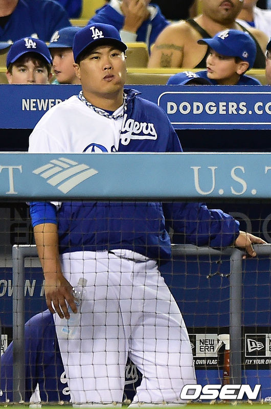 6회말 LA 다저스 류현진이 교체된 뒤 더그아웃에서 경기를 관전하고 있다./youngrae@osen.co.kr