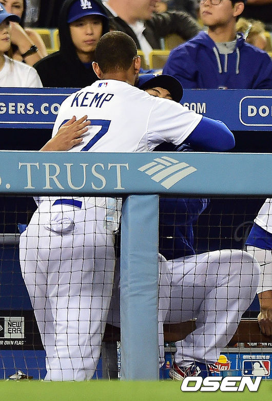 6회말 교체 된 LA 다저스 류현진이 더그아웃에서 맷 켐프와 포옹을 하고 있다./youngrae@osen.co.kr