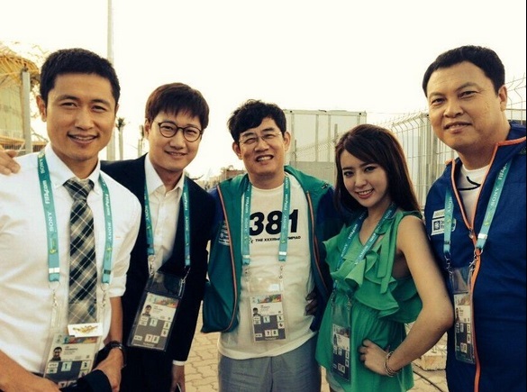 사진 속에는 정지원 아나운서와 함께 SBS ‘힐링캠프, 기쁘지 아니한가’의 MC 이경규와 국가대표팀을 응원하기 위해 브라질에 간 전 국가대표 선수 이운재, KBS 2TV ‘우리 동네 예체능’ 축구 편에 출연한 조우종 아나운서, KBS 해설위원 이영표 등과 함께 다정한 포즈를 취하고 있다.