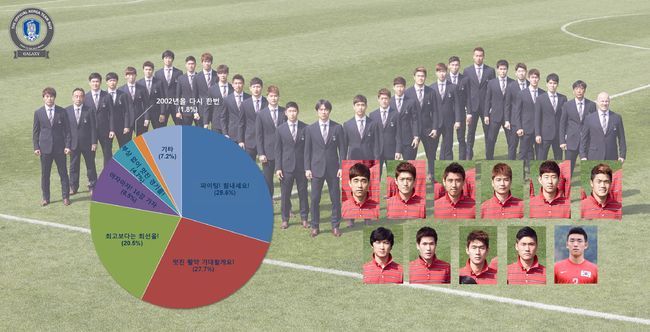 조사 결과에 따르면 전체 선수 중 757건(10.8%)으로 가장 많은 응원 메시지를 받은 선수로는 대표팀의 막내이자, 최고의 기대주로 주목 받고 있는 '손세이셔널' 손흥민이 차지했다. 뒤를 이어 주장을 맡은 구자철이 752건(10.7%)으로 2위, 대표팀의 수문장 정성룡(732건, 10.5%)은 3위를 차지했다.