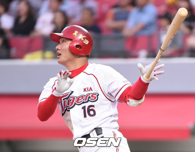17일 오후 광주 챔피언스필드에서 열린 '2014 한국야쿠르트 세븐 프로야구' KIA 타이거즈와 넥센 히어로즈의 경기, 3회말 무사 1루 김주찬 중월 동점 투런 홈런을 날리며 타구를 바라보고 있다.