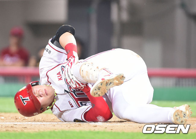 17일 오후 광주 챔피언스필드에서 열린 '2014 한국야쿠르트 세븐 프로야구' KIA 타이거즈와 넥센 히어로즈의 경기, 7회말 2사 1,2루 안치홍 왼쪽 무릎에 몸에 맞는 공을 맞고 괴로워하고 있다.