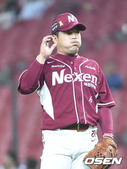 17일 오후 광주 챔피언스필드에서 열린 '2014 한국야쿠르트 세븐 프로야구' KIA 타이거즈와 넥센 히어로즈의 경기, 8회말 2사 1,2루 상황, 신종길을 볼넷으로 진루시키며 만루위기 상황에서 넥센 마정길이 아쉬워하고 있다.