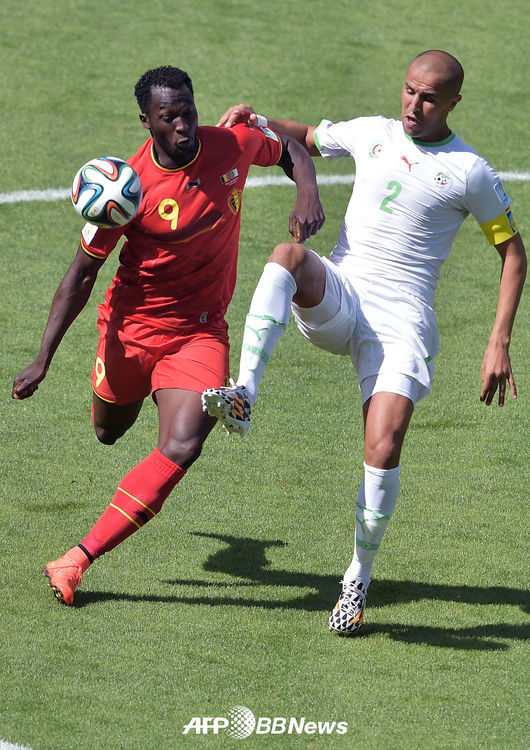 전반 벨기에 루카쿠와 알제리 부게라가 볼을 다투고 있다.