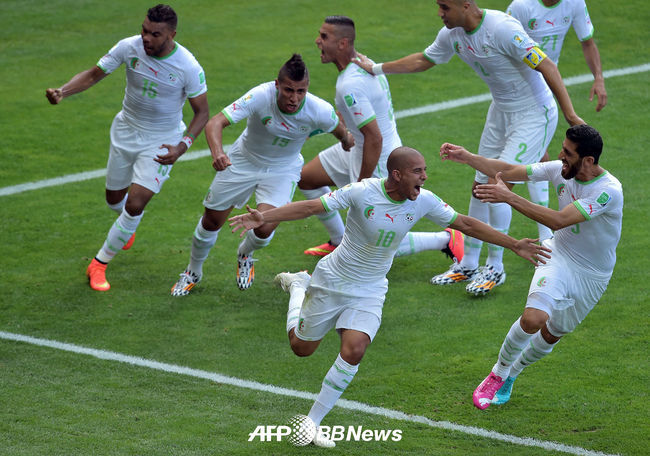 전반 23분 벨기에 얀 베르통헨이 알제리 소피앙 페굴리에게 페널티 박스 안에서 파울을 범했다. 페널티킥 키커로 나선 페굴리가 침착하게 슛을 성공시키며 선제골을 기록, 동료선수들과 기뻐하고 있다.