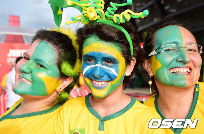 경기에 앞서 브라질 축구팬들이 취재진을 향해 포즈를 취하고 있다.