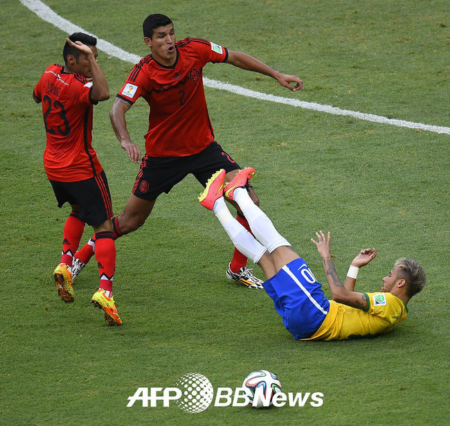 전반 브라질 네이마르가 멕시코 수비수의 파울에 그라운드에 넘어지고 있다.