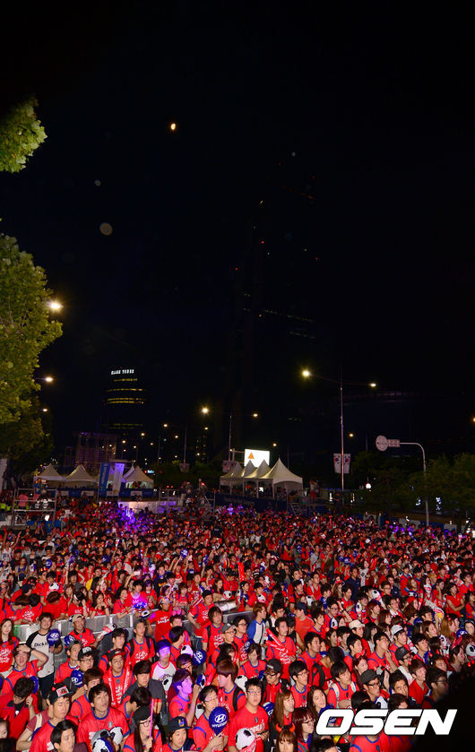 한국과 러시아의 2014 FIFA 월드컵 첫 경기를 앞두고 18일 오전 서울 삼성동 코엑스 사거리 영동대로에서 진행된 '김창렬의 올드스쿨' 거리응원에서 수많은 축구팬들이 열띤 응원을 펼치고 있다.