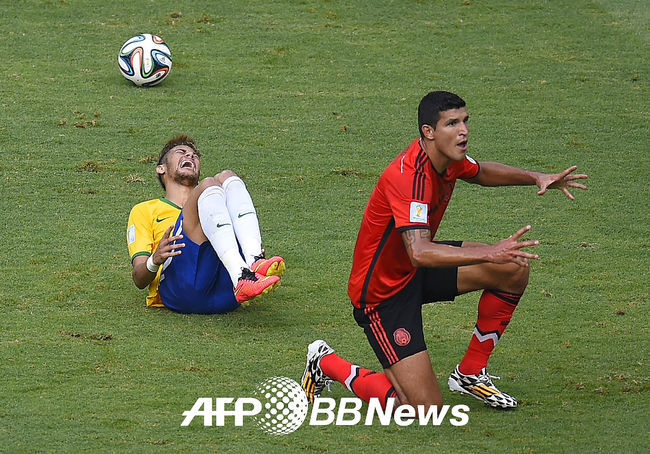 전반 브라질 네이마르가 멕시코 로드리게스의 태클에 걸려 괴로워하고 있다.