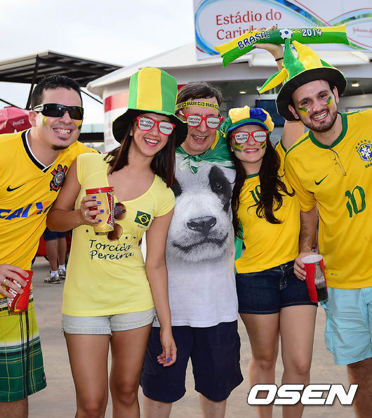 경기에 앞서 브라질 축구팬들이 열띤 응원을 펼치고 있다.