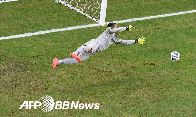 브라질 세자르가 몸 날려 슛을 막아내고 있다.
