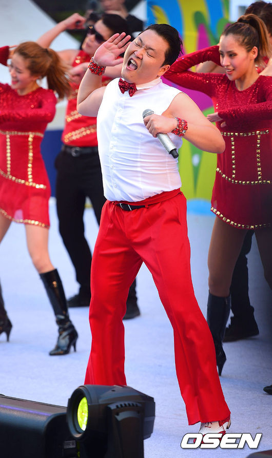 한국과 러시아의 2014 FIFA 월드컵 첫 경기를 앞두고 18일 오전 서울 삼성동 코엑스 사거리 영동대로에서 진행된 길거리 응원전에서 가수 싸이가 멋진 무대를 펼치고 있다.