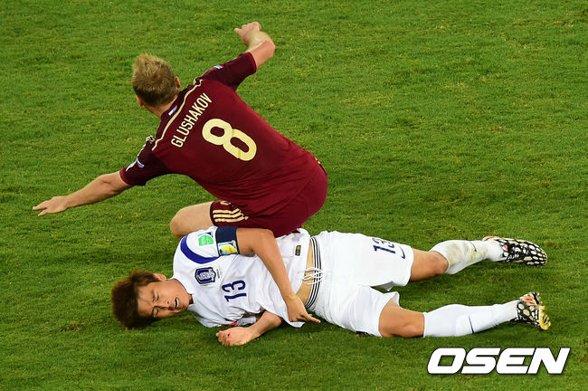 전반 대한민국 구자철이 러시아 손흥민이 러시아 글루샤코프에 밀려 넘어지고 있다.