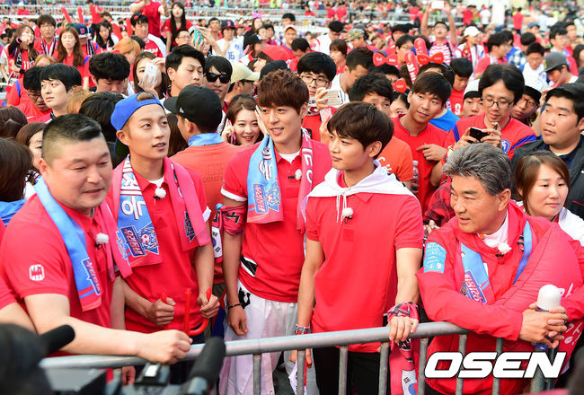 우리동네예체능 팀 강호동, 운두준, 민호, 이덕화, 이정 등이 응원전에 나서 응원을 펼치고 있다.