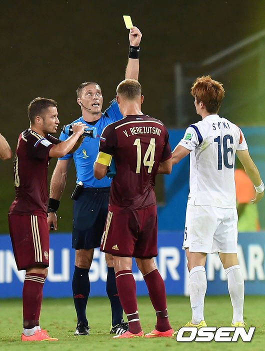 전반 대한민국 기성용이 옐로우 카드를 받고 있다.