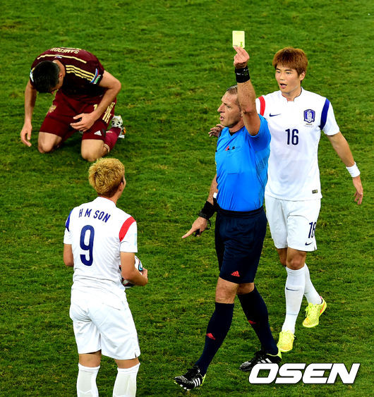 전반 대한민국 손흥민이 경고를 받고 있다.