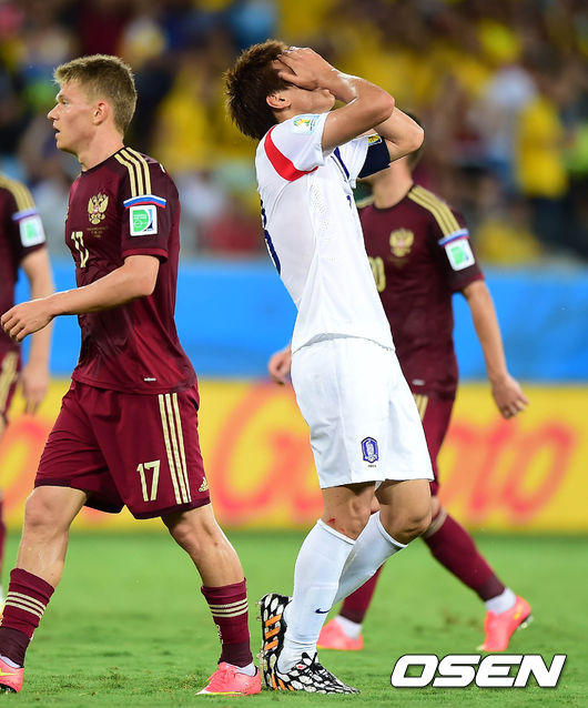 18일(이하 한국시간) 브라질 쿠이아바 아레나 판타날에서 2014 브라질 월드컵 조별리그 H조 한국과 러시아의 경기 전반 구자철의 슈팅이 골문을 살짝 벗어나자 아쉬워 하고 있다.