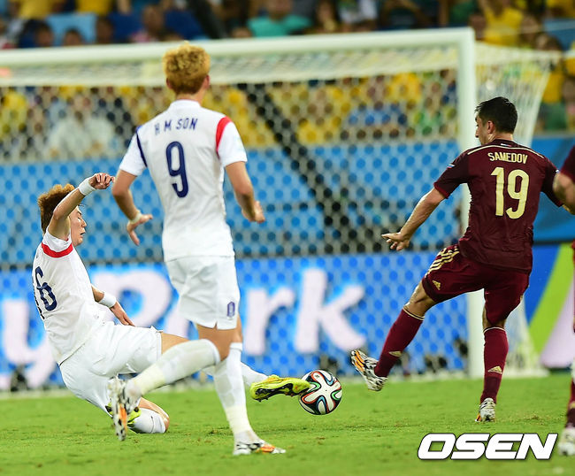 18일(이하 한국시간) 브라질 쿠이아바 아레나 판타날에서 2014 브라질 월드컵 조별리그 H조 한국과 러시아의 경기 전반 기성용이 스메도프에 강한 태클을 들어가고 있다. 옐로우 카드를 받았다.