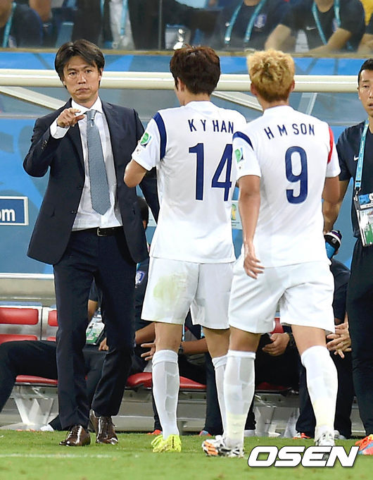 전반 대한민국 홍명보 감독이 선수들에게 작전을 지시하고 있다.