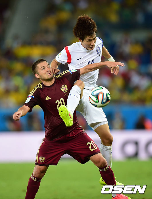 18일(이하 한국시간) 브라질 쿠이아바 아레나 판타날에서 2014 브라질 월드컵 조별리그 H조 한국과 러시아의 경기 전반 한국영이 러시아 선수와 볼을 다투고 있다.