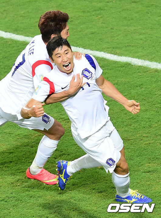 후반 대한민국 이근호가 선제골을 성공시키고 이청용과 기뻐하고 있다.