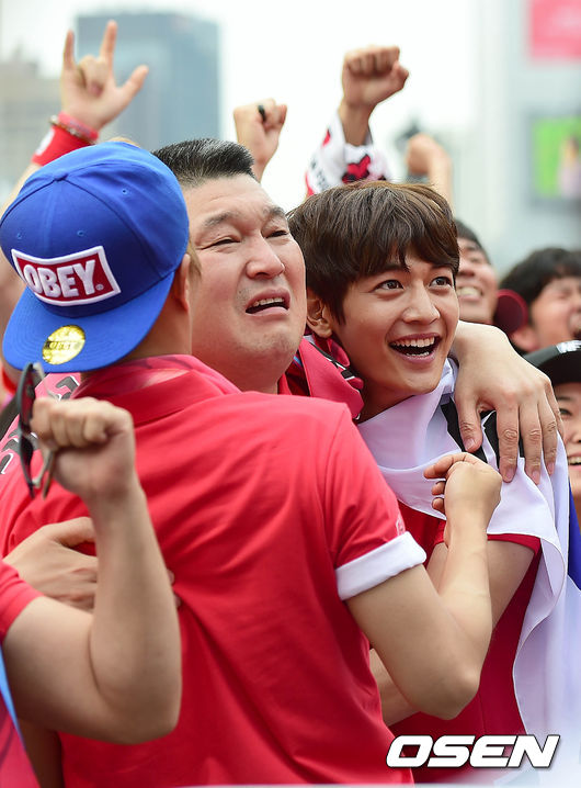 후반 대한민국 이근호의 첫 골이 터지자 예체능 팀 강호동과 샤이니 민호가 환호하고 있다.